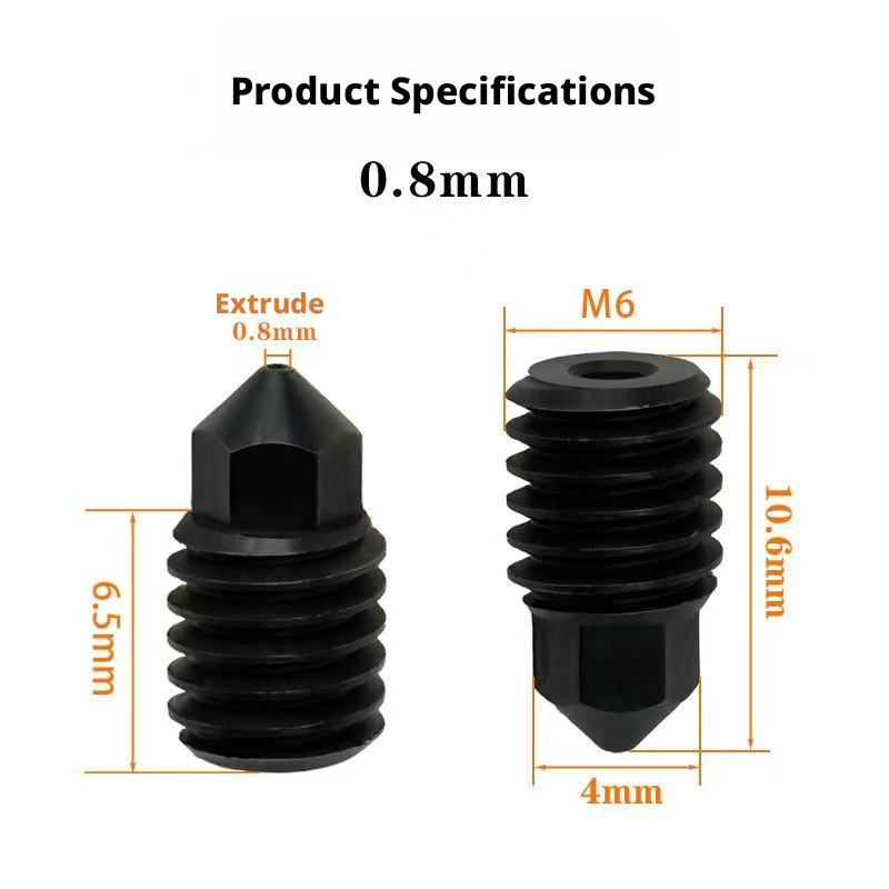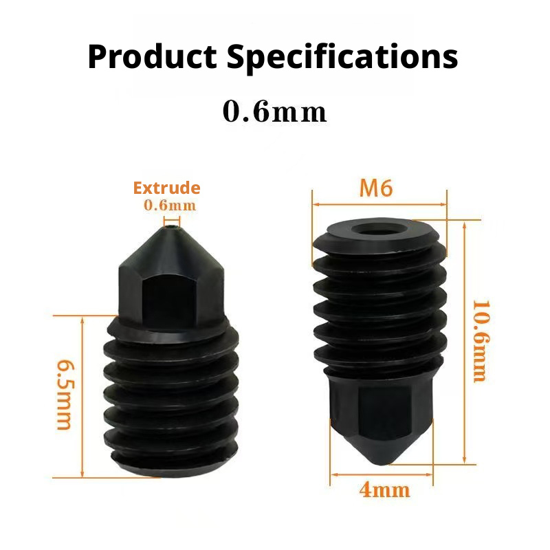 Feibo hardened steel nozzles are wear-resistant, high-temperature resistant, and have good internal impact strength. They have an outer diameter of 4mm, M6 thread, and an inner diameter of 0.4/0.6/0.8mm, making them less prone to clogging.